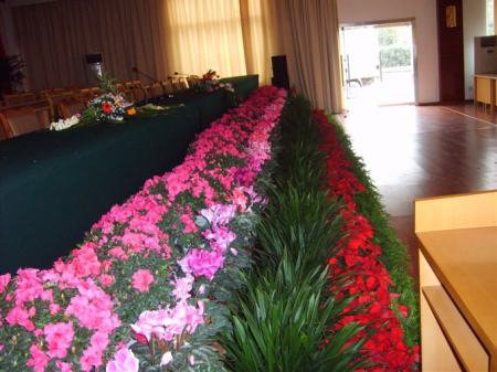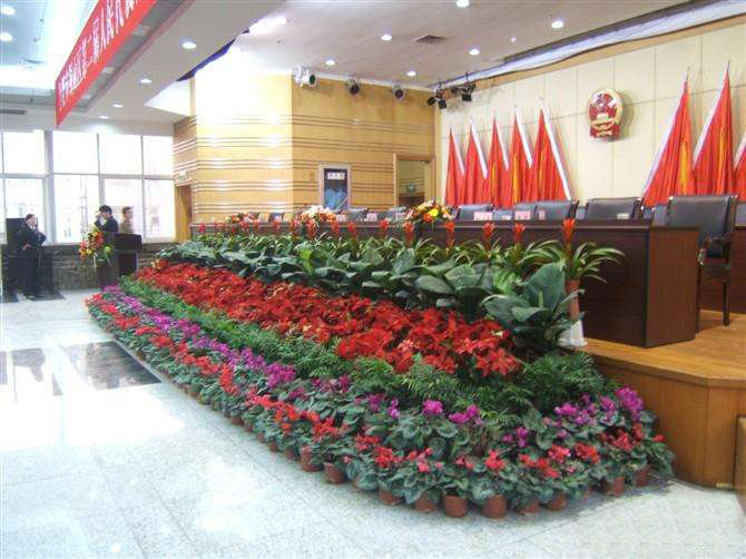 最常见的是非节日的普通布置,这类布置一般多采用鲜花和绿植的合理搭配,一般采用一些高大植物摆在主席台的背后做为背景,例如棕竹、散尾葵等,然后用些小盆植物或花卉放在主喜台的下方做为呼应,常用的植物有一叶兰、一品红、也门铁等等植物。另外在会场四周合理的摆放植物也是不错的选择,常用的植物有大叶伞、巴西木、绿箩等。另外鲜花的布置也在会场布置里起到画龙点睛的作用。例如在会场入口插一盆较大的迎宾花卉、和在主席桌和宾客的座位上摆放一盆插花,效果不言而语。